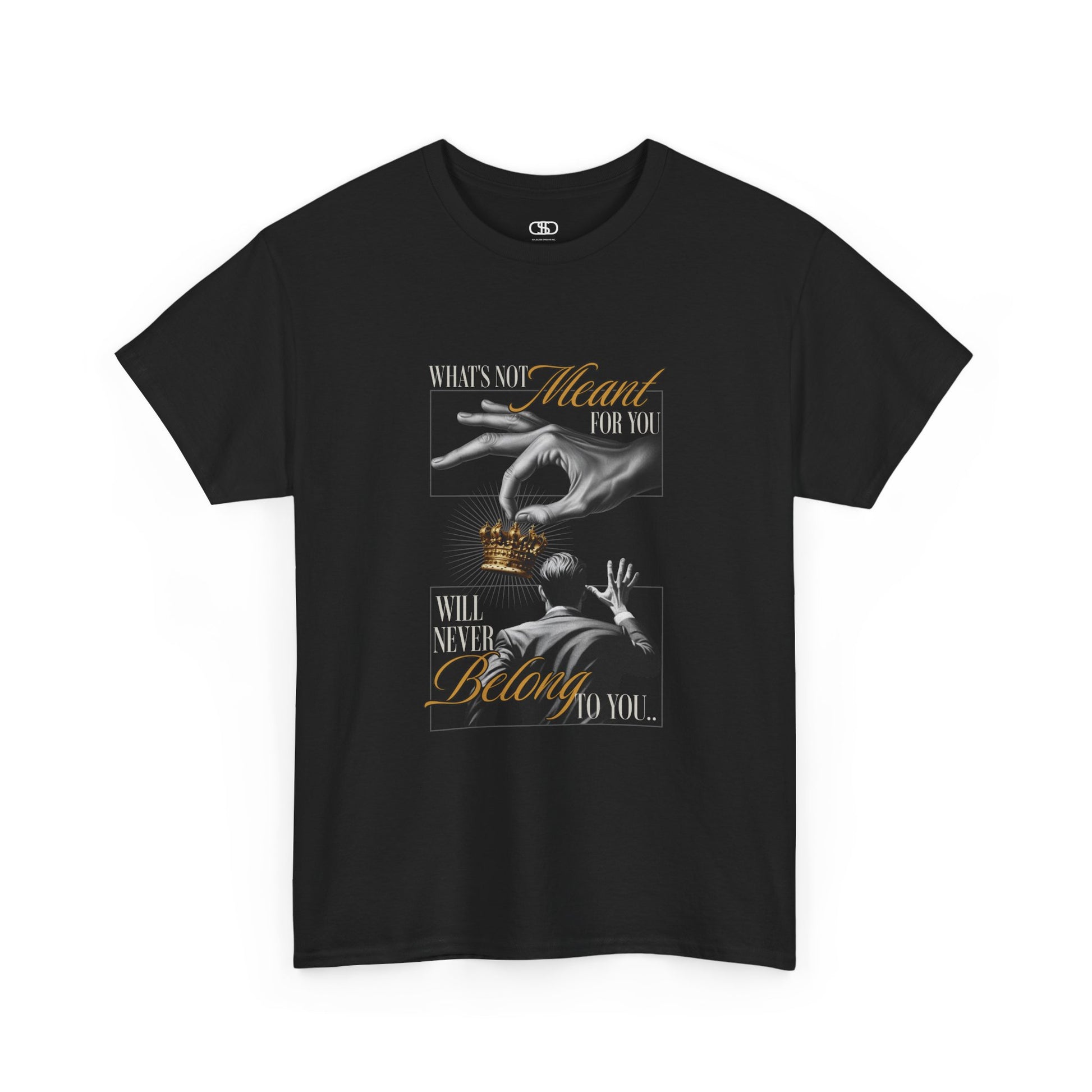 Wear a powerful message with our "What's Not Meant For You" collection. This impactful design features a hand holding a crown, while a man below reaches for it with visible regret, emphasizing the profound truth: "What’s Not Meant for you, Will Never Belong To you." A deep reflection on destiny and acceptance. Available in t-shirt, hoodie, and sweater styles.